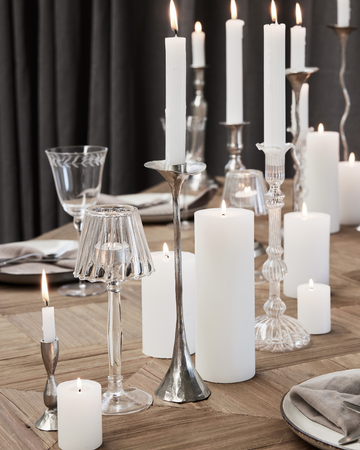 Sæt gerne lys i flere højder – fx fyrfadslys kombineret med høje stearinlys – og brug skinnende materialer til at reflektere lyset.