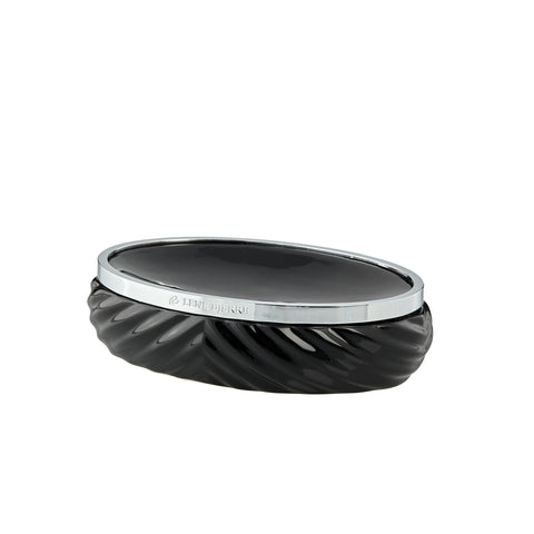 Milda sæbeholder i keramik i sort med en sølv kant fremstillet af zink legering.