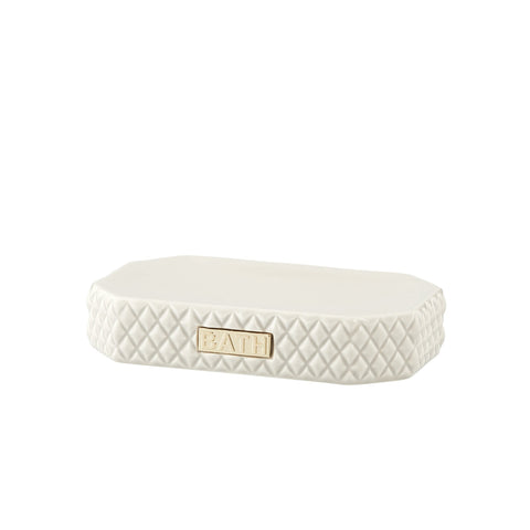 Marion sæbeholder i keramik med et Bath mærke. Sæbeholderen er både praktisk og dekorativ. Den er perfekt til opbevaring af sæben på badeværelset. Sæbeholderen er en del af Marion serien, der indeholder badeværelsestilbehør i et eksklusivt design, der tilfører elegance på badeværelset.