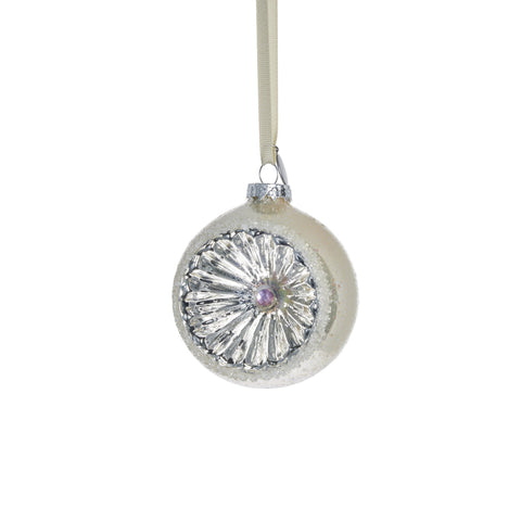 Denne vintage-inspirerede glas Hevig fanger magien fra juletiden med sit delikate design og nostalgiske charme. Med en blød, afdæmpet råhvid nuance og en frostet finish, glitrer den med en iskold elegance. En strålende sølvindrykning i midten reflektrer lyset smukt og skaber en blændende effekt, der skaber en nostalgisk følelse. Mix og match med et andet julepynt fra Lene Bjerre og skab en fantastisk julestemning i dit hjem.Produkt:
