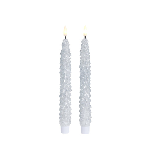 2 pak. Disse LED-lys bringer et festligt og fortryllende præg til enhver juledekoration. Designet i form af elegante, frostede fyrretræer, udsender de et varmt, flakkende lys, der efterligner charmen ved ægte stearinlys uden bekymring for en åben flamme. De intrikate teksturerede detaljer tilføjer dybde og glans, hvilket gør dem til et smukt midtpunkt til sæsonens dekorationer, spiseborde eller hylder. Perfekte til at skabe en hyggelig vinterlandskabsstemning, tilbyder disse batteridrevne LED-lys både bekvemmelighed og tidløs julecharme.Produkt: LED krone lys