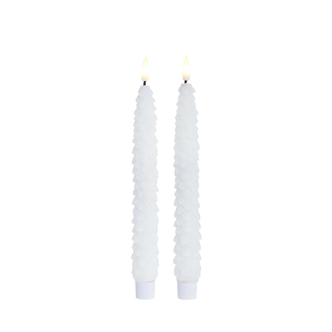 2 pak. Disse LED-lys bringer et festligt og fortryllende præg til enhver juledekoration. Designet i form af elegante, frostede fyrretræer, udsender de et varmt, flakkende lys, der efterligner charmen ved ægte stearinlys uden bekymring for en åben flamme. De intrikate teksturerede detaljer tilføjer dybde og glans, hvilket gør dem til et smukt midtpunkt til sæsonens dekorationer, spiseborde eller hylder. Perfekte til at skabe en hyggelig vinterlandskabsstemning, tilbyder disse batteridrevne LED-lys både bekvemmelighed og tidløs julecharme.Produkt: LED krone lys