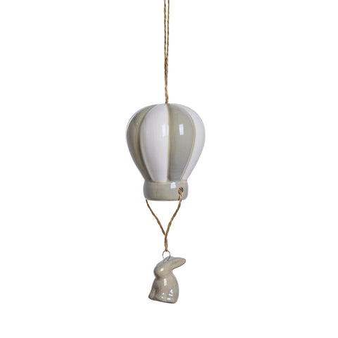 Ophænget er formet som en luftballon, malet i bløde nuancer af mørk brun og hvid, og hænger fra en jutesnor, hvilket giver den et luftigt og eventyrligt udtryk. Under luftballonen hænger en lille keramisk kanin, som tilføjer et sødt og finurligt element til designet. Denne dekoration er perfekt til at tilføje en smule magi til ethvert rum, hvad enten det er i børneværelset eller som en del af din påskeudsmykning.