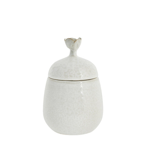 Denne fine Helinna krukke fra Lene Bjerre i farven hvid forener funktion og elegance i ét enkelt design. Krukken er udført i glaseret keramik med en glat struktur og toppet med et dekorativt låg, der afsluttes med en blomstret knop som håndtag. Perfekt til opbevaring af småting i køkkenet, på badeværelset eller som ren dekoration i stuen.Produkt: krukke