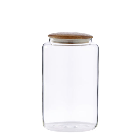 Enkel transparent krukke i glas med låg af acacietræ i farven .