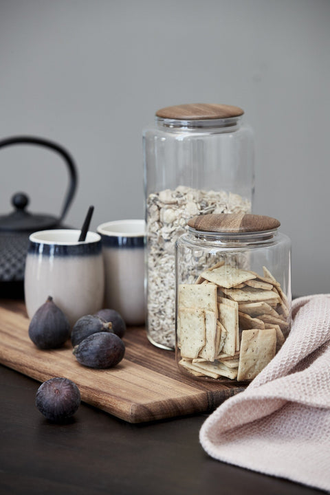 Enkel transparent krukke i glas med låg af acacietræ i farven .