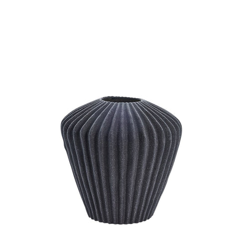 Klassisk mørkegrå farvet keramikvase designet med elegante, subtile riller. Vasen måler L16,5xB16,5xH16,5 cm. og med sit stilrene design er vasen perfekt til at skabe en stilfuld og elegant atmosfære i dit hjem.