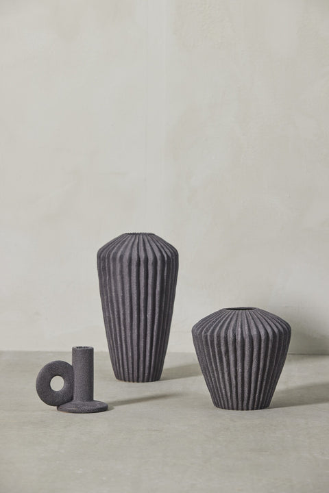 Klassisk mørkegrå farvet keramikvase designet med elegante, subtile riller. Vasen måler L16,5xB16,5xH16,5 cm. og med sit stilrene design er vasen perfekt til at skabe en stilfuld og elegant atmosfære i dit hjem.